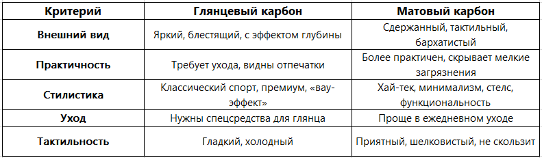 - Выбирайте матовый карбон, если вы цените сдержанную элегантность, функциональность и тактильные ощущения. Это выбор для тех, кто понимает в материалах и предпочитает, чтобы технологичность ощущалась, а не кричала.